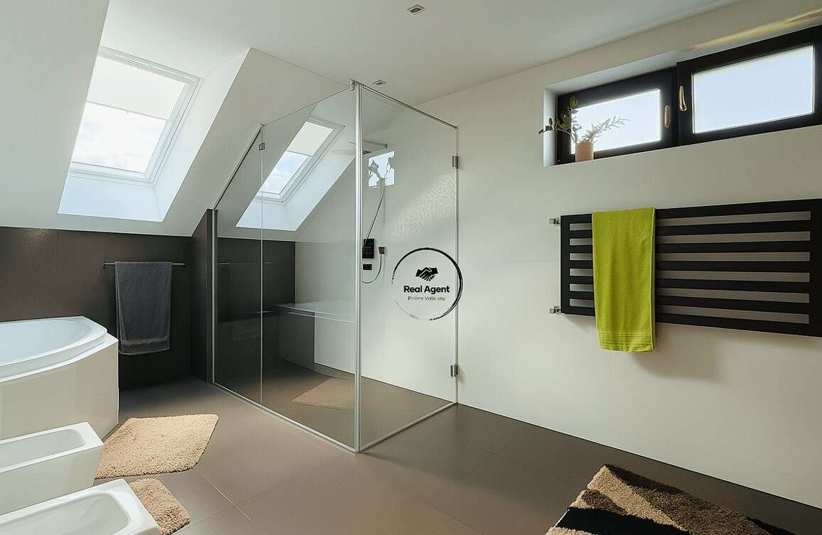 Priestranná kúpeľňa s rohovou vaňou, veľkým sprchovým kútom, dvojumývadlom, WC a bidetom